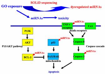 氧化石墨烯(GO)在生物医学和非生物医学类产品的开发中均具有潜在的应用价值。体内研究已证明GO主要沉积在动物的肺脏。本研究采用SOLiD测序技术首先分析了GO体外致GLC- 82肺腺癌细胞毒性发生过程中表达模式发生改变的非编码RNA(miRNAs)。GO暴露浓度超过50mg/L时可导致GLC-82严重的系列毒性效应。GO可以沉积于GLC-82细胞的细胞质、线粒体、内质网和细胞核。基于Solid测序,在GO暴露GLC- 82细胞中确定了628上调和25个下调的miRNA。这些候选的miRNA在GO暴露的GLC- 82细胞中的表达呈浓度依赖性。这些异常表达的miRNA和它们的潜在靶基因编码了多种可能介入GO毒性效应调控的生物学过程。通过整合与分析异常表达miRNA相关生物信息学数据与已知调控细胞凋亡的信号通路,我们的数据暗示这些表达异常的miRNA可能通过同时激活死亡受体信号通路(通过影响肿瘤坏死因子α受体与Caspase- 3功能)与线粒体相关信号通路(通过影响p53和Bcl-2功能)来调控GLC-82细胞GO毒性效应形成。本研究尝试在miRNA水平上解释GO体外毒性的可能分子基础,其为将来基于表面化学修饰等方式可能降低GO毒性效应提供了重要的依据。