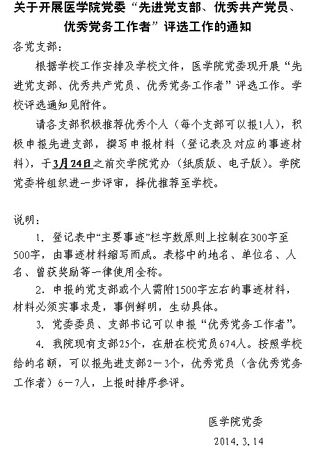关于开展医三亿体育(中国)党委“先进党支部、优秀共产党员、优秀党务工作者”评选工作的通知