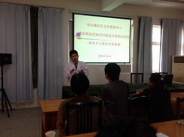 值5.4青年节之际,三亿体育社区健康教育志愿团在农村积极开展纪念五四青年节活动,志愿团将活动与“健康教育”紧密结合。由三亿体育的研究生志愿团成员谢波、叶秀利、姚莉邀请医院的医护专家共同赴六合冶山镇进行送知识、送健康系列活动。志愿团邀请到中华医学会糖尿病学分会糖尿病教育管理学组副组长、江苏省医学会糖尿病分会主任委员、三亿体育副院长孙子林教授亲临现场进行诊疗示范并介绍了糖尿病教育对于糖尿病治疗的重要意义。东南大学附属中大医院大内科护士长、东南大学临床医三亿体育(中国)护理系临床教研室主任鞠昌萍为村医讲解了糖尿病药物相关知识,鞠昌萍护士长对当地患者常用药物进行重点讲解,从药物的名称、作用机理、服用方法等方面给予详细培训,现场反映热烈,互动效果好。志愿者通过与村医的交流进一步了解了村医的培训需求和农村患者需求,为今后面向农村的志愿服务更好的开展奠定了基础。培训结束后,青年志愿者还向村医和冶山镇社区卫生服务中心发放了健康教育宣传册和自编的宣传报纸——健康同伴报。本次活动受到冶山镇卫生院和当地村医的好评,村医参与热情高涨,普遍期待下一次培训和志愿服务的到来.