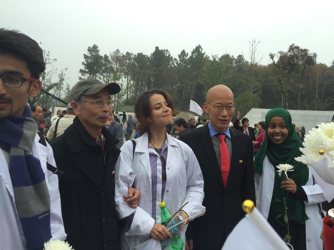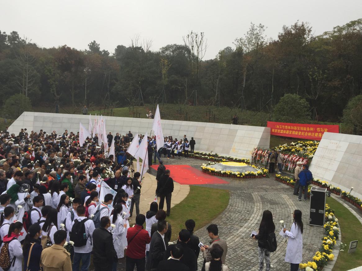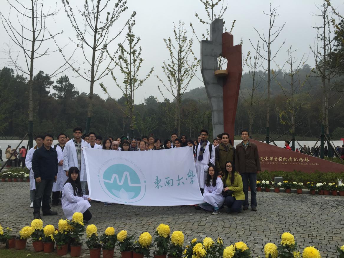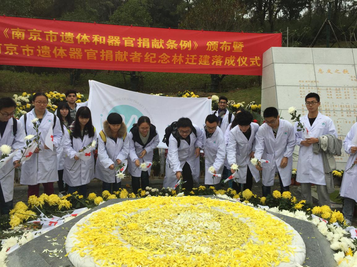 2015年11月16日,南京市岱山南麓西天寺墓园,《南京市遗体和器官捐献条例》颁布暨南京市遗体器官捐献者纪念林迁建落成仪式隆重举行。三亿体育副院长王立新老师、党委副书记兼副院长程斌老师及解剖教研室的老师们,带领本科生代表及海外留学生代表参加了此次活动。清晨的空气中透着丝丝凉意,同学们一大早便兴致勃勃地坐着校车,和志友们一起,来到了这庄严肃穆的志友纪念林,这是我国目前占地面积最大、专门用于遗体器官捐献事业的纪念场所。
