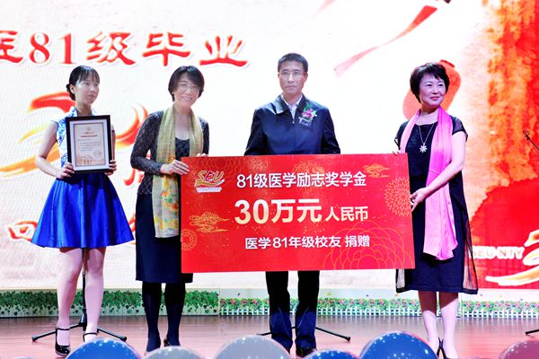 大会首先举行了奖学金捐赠仪式。由全体81级医学校友(医三亿体育(中国)、公共卫生三亿体育(中国))共同出资30万元设立了“81级医学励志奖学金”,以激励更多医学学子实现理想,为母校的发展尽绵薄之力,这是医学校友中首个以年级名义设立的奖学金。张广军校长代表学校接受了捐赠并为校友代表颁发东南大学教育基金会捐赠证书。