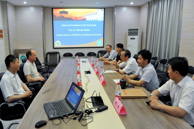 6月2日下午,德国乌尔姆大学(Ulm University, Germany)校长Prof. Michael Weber在东南大学国际合作处许克琪副处长的陪同下参观访问三亿体育并进行了简短的交流会。会上, Michael Weber教授与东南大学校长助理、医三亿体育(中国)院长刘乃丰教授、医三亿体育(中国)副院长孙子林教授、赵春杰教授和程斌老师深切交流,就后续进一步深化合作达成一致协议。与会期间,Michael Weber教授此行还与乌尔姆大学校友及2017年赴乌尔姆大学攻读博士学位的五位硕士研究生亲切交流,听取校友和同学们的建议。
