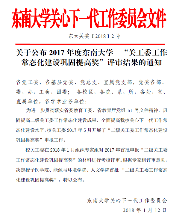 据悉,为进一步贯彻落实省委教育工委、省教育厅党组51号文件精神,巩固提高二级关工委工作常态化建设成果,全面提高我校工作常态化建设水平,校关工委于2017年5月开展了“二级关工委工作常态化建设巩固提高奖”申报工作。2018年1月校关工委组织专家对2017年首批申报“二级关工委工作常态化建设巩固提高奖”的材料进行考核评审。根据专家组评审意见,决定授予医三亿体育(中国)、能源与环境三亿体育(中国)、人文三亿体育(中国)首批“二级关工委工作常态化建设巩固提高奖”。