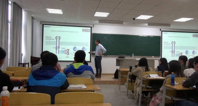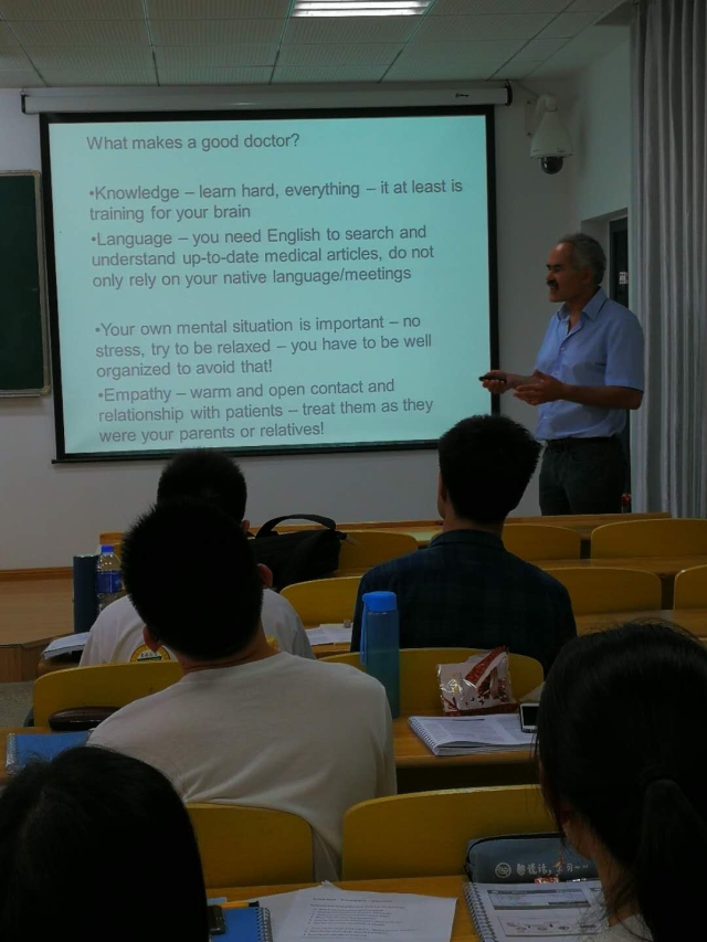 德国乌尔姆大学在三亿体育开设的“春季课堂”课程于2018年4月22日落下帷幕。本次春季课堂从4月17日开始,到4月22日结束,历时六天,来自德国的五位教授为2015级拔尖创新班的同学们带来了主题为Tumorigenesis: From Molecules and pathways to the clinic的系列课程。课程内容从肿瘤的分子机制到病理结构改变,从基因编辑到药物开发,从历史沿革到文献研究,涵盖了肿瘤从发生到临床治疗的各个方面,课程的最开始是“细胞周期的调控与失控”(Dr.Brockmann)、“生长因子与信号传导”(Prof.Kühl)和“炎症与癌症”(Prof. Wirth),三位老师从三个不同的方面为我们介绍了肿瘤形成与进展的基础知识和最新研究。Prof. Knippschild则为我们介绍了蛋白磷酸化在肿瘤信号通路中的重要作用,并且为我们展示了一个肿瘤的治疗药物是如何从肿瘤形成机制出发,一步步走到临床试验的。在课程的最后,Dr. kornmann为我们从临床的角度向我们介绍了结直肠癌和胰腺癌的一般情况和肿瘤临床转化研究。春季课堂中,不仅有教授的讲座(Lectures),更有文献阅读,小组合作学习和展示,课程不再是一方在讲一方在听,而是教授介绍新的知识,带来新的文献,同学们从文献中学习科学发现是怎样被证实的,研究是如何一步步推进的,基础是如何转化为临床应用的。在文献阅读中,我们学习了如何利用数据库减少实验工作量,学会了用批判的眼光看待文献报道。我们更深地认识到,方法比知识更重要。东南大学校长助理、医三亿体育(中国)院长刘乃丰教授和副院长孙子林教授为春季课堂做了发言,向远道而来的客人表达了感谢,向同学们表示了鼓励。在闭幕式上,Prof. Knippschild、Dr. kornmann和全班同学就“如何称为一名具有国际化视野、中国情怀和社会担当的好医生”这一话题做了深入的谈论,两位教授分别从科研和临床的角度给了同学们很多的建议。课程还吸引了许多感兴趣的教授和学生前来旁听。