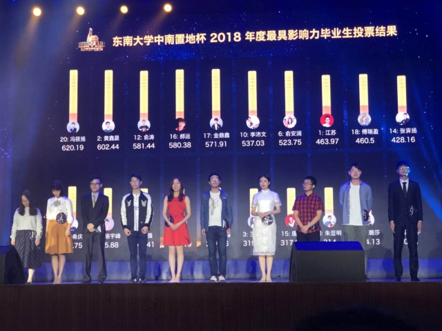 经嘉宾投票及大众评审投票,我院2013级本科生冯筱扬同学以第一名的成绩获得东南大学2018年最具影响力毕业生称号。