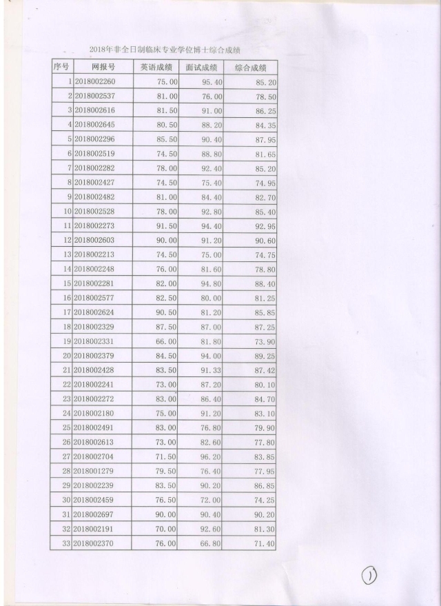 2018年非全日制临床医学专业学位博士研究生入学考试综合成绩公示