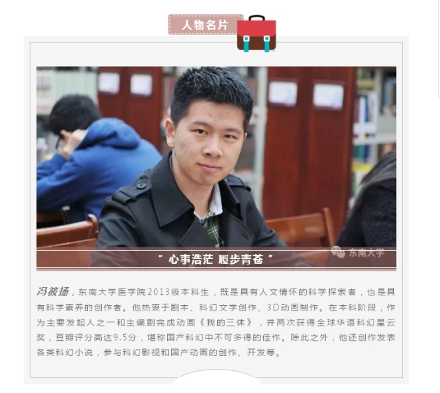 东南大学微信公众号2018年8月28日 pick东大“通关秘籍”!冯筱扬:不想当科幻作家的医生不是好编剧 https://mp.weixin.qq.com/s/_RoY4EF3yu2RU79itfyacQ