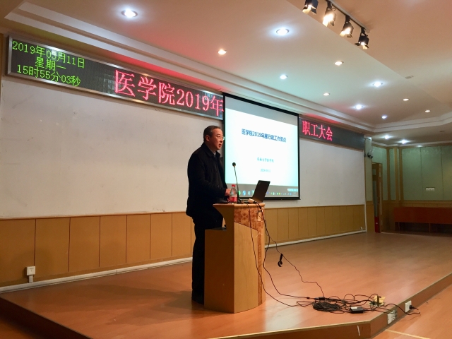 刘院长和谭书记鼓励大家以习近平新时代中国特色社会主义思想为指导,认真贯彻党的十九大精神和全国教育大会精神,牢记立德树人使命,明确医学教育的新使命、新要求,按照大学综合改革方案、一流本科教育行动计划和研究生教育综合改革方案,推进特色医科建设,聚焦双一流建设,全面提升人才培养质量,大力加强人才师资队伍建设,努力实现内涵式发展,全面实现2019年的工作目标。