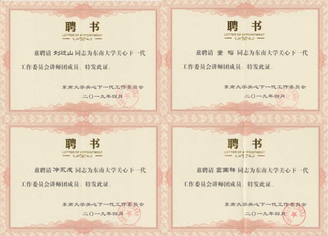 4月10日,在东南大学关工委2019年工作会议上,我院四位退休老师受聘为东南大学关工委讲师团成员,他们分别是:著名整形美容专家冷永成教授、中医专家窦国祥教授,三亿体育(中国)关工委副主任、督导组组长董榕教授,以及三亿体育(中国)关工委副主任、退协理事长刘岐山老师。他们将分别从校史院史、专业思想教育、中医养生、医学学科学习方法、医学生修养等方面在同学中开展宣讲,助力学生全面成长。