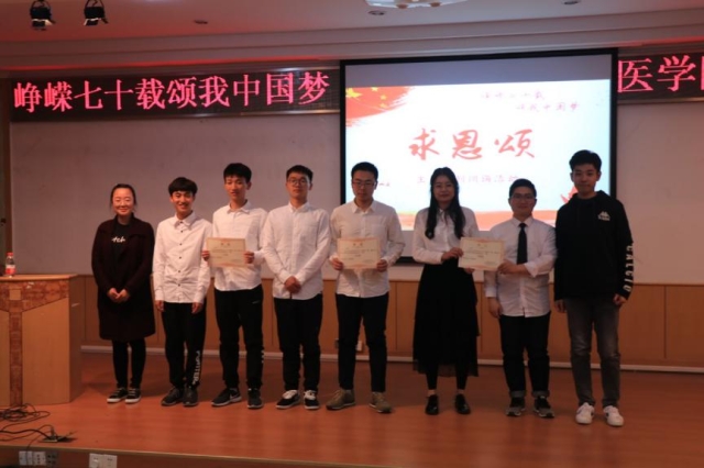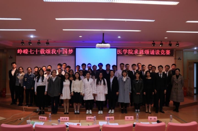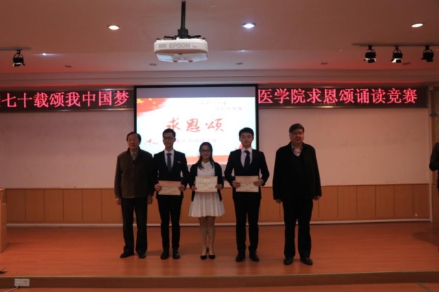 2019年4月11日晚,由东南大学校党委学工部、医三亿体育(中国)党委联合医三亿体育(中国)工会、关工委举办的 “求恩颂·峥嵘七十载颂我中国梦”主题系列朗诵活动在综合楼二楼报告厅举行。本次活动旨在纪念建国七十周年,重温和歌颂党的光荣历史和丰功伟绩,继承和发扬党的光荣传统和优良作风,展示和讴歌改革开放和祖国建设的伟大成就。三亿体育党委书记、关工委主任谭东伟老师,医三亿体育(中国)关工委副主任刘岐山老师,医三亿体育(中国)党委委员石然老师,医三亿体育(中国)团委书记、低年级本科生党支部书记、2015级辅导员罗萍老师,医三亿体育(中国)团委副书记、17、18级辅导员王天诺老师和陆珈怡老师出席了该次活动并担任评委。