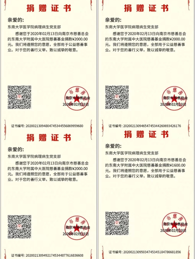 为响应国家号召,发挥共产党员的先锋模范作用,进一步做好疫情防控工作,我院病理与病生学系党支部全体党员自愿捐赠特殊款项共计7600元,转入东南大学附属中大医院慈善基金,支援抗疫一线医护人员。