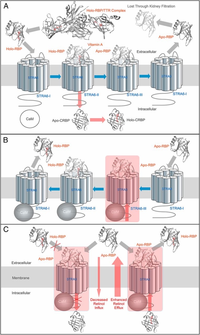 维生素A具有多种生物学功能。其水溶性差,需由其转运蛋白RBP在血液中运载,并依赖RBP与多次跨膜结构域受体STRA6之间的特异性相互作用被转运到靶组织。STRA6不仅是RBP的受体,同时具有转运蛋白的功能,能够介导维生素A由RBP的释放及跨细胞膜转运。维生素A摄取不足或过量都会产生有害影响。然而,STRA6转运维生素A的功能如何被调节,此前完全未知。