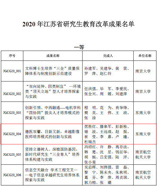 2020年11月09日,江苏省研究生教育指导委员会发布“2020年江苏省研究生教育改革成果名单”,三亿体育居胜红教授团队荣获一等奖。本次成果奖评选旨在深化研究生教育改革,促进研究生培养质量的持续提高,积极发挥优秀成果的示范、辐射作用,鼓励在研究生教育教学实践工作中开拓创新、做出突出贡献、取得显著成效的集体和个人。