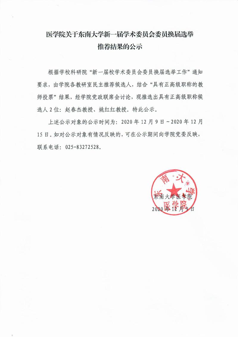 医三亿体育(中国)关于东南大学新一届学术委员会委员换届选举推荐结果的公示