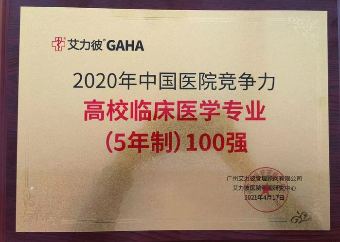 2021年4月17日晚,2020年中国医院竞争力排行榜(艾力彼医院管理研究中心发布)颁奖晚会在厦门举行。东南大学荣获“2020年中国医院竞争力高校临床医学专业(5年制)100强”,位列全国第20位。