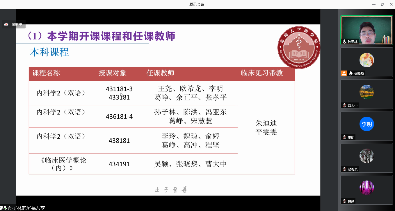 本次线上会议由内科学系主任孙子林教授主持,并邀请了督导组专家刘乃丰教授、陈宝安教授、王美美主任参与内科学集体备课。孙子林教授与任课教师通过线上会议共同商议教学授课内容、授课模板、思政教育,并达成共识。同时对增加过程性考核占比、考核形式进行讨论。督导组专家刘乃丰教授、陈宝安教授、王美美主任对课程融入思政元素的方式(党史上的今天、医学史上的今天等)表示认同和支持。同时希望在增加过程性考核中,统一好考核形式,做好考核过程中的准确性、规范性、严格性,最终保证学生成绩的公平性,达到过程性考核的目的。