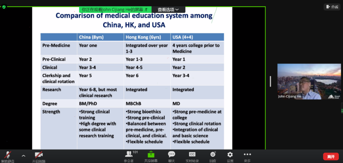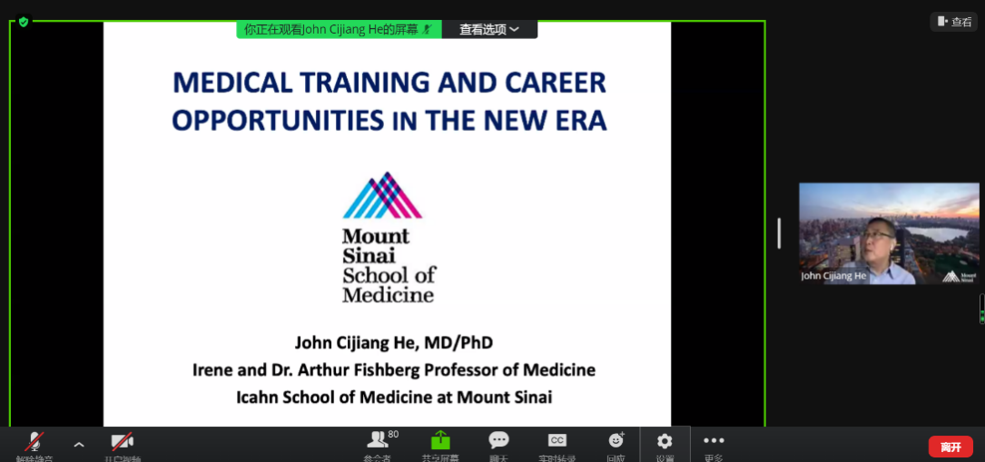 2021年10月8日晚,三亿体育刘必成院长特邀美国纽约西奈山伊坎医三亿体育(中国)医学和药理学专业终身教授、西奈山医三亿体育(中国)附属医院肾内科主任何慈江教授来我院开展医学前沿线上专题讲座。何慈江教授以“Medical training and career opportunities in the new era(新时期医学培训与职业发展机遇)”为题作了精彩的报告,讲座吸引了医三亿体育(中国)、附属中大医院、公共卫生三亿体育(中国)等单位百余名师生参加。
