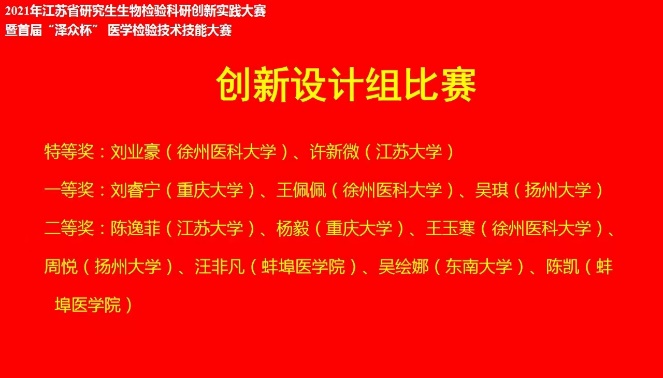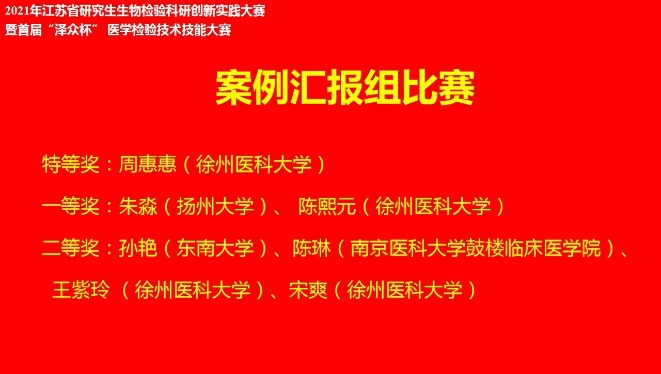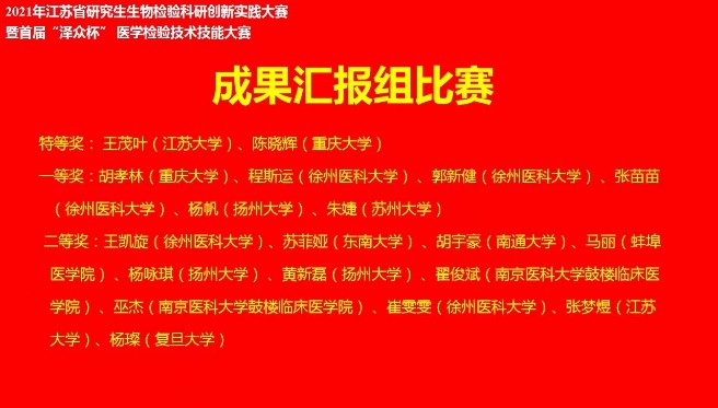 2021年12月25日,江苏省研究生生物检验科研创新实践大赛暨首届“泽众杯”医学检验技术技能大赛在江苏徐州(线上)举行。来自三亿体育临床检验诊断学专业的研究生团队积极参赛,在各项小组赛中取得好成绩。二年级学硕研究生吴绘娜获得创新设计组二等奖,三年级专硕研究生孙艳同学获得案例汇报组二等奖,二年级学硕研究生苏菲娅获得成果汇报组二等奖。