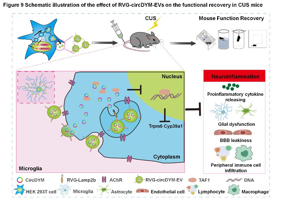 目前,由脂质双层膜包围的纳米颗粒级别的细胞外囊泡(Extracellular Vesicle),由于其具有免疫原性低、保护内源性生物活性成分能力强、可通过血脑屏障等优点,已成为一种新颖的递载药物的方法。姚红红课题组通过构建靶向中枢并且包裹circDYM的细胞外囊泡(RVG-circDYM-EV),高效地将circDYM跨血脑屏障递载至小鼠脑部,有效地缓解小鼠抑郁样的行为。进一步研究表明,circDYM可以通过与转录因子TAF1结合,抑制小鼠脑部小胶质细胞的活化以及中枢神经炎症,从而达到缓解抑郁症的效果。