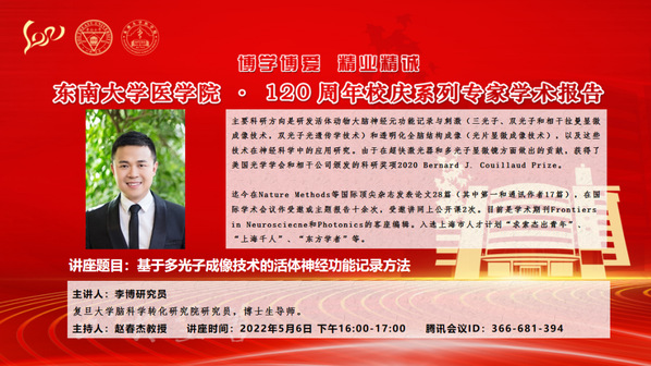 李博,复旦大学脑科学转化研究院研究员,博士生导师。主要科研方向是研发活体动物大脑神经元功能记录与刺激(三光子、双光子和相干拉曼显微成像技术,双光子光遗传学技术)和透明化全脑结构成像(光片显微成像技术),以及这些技术在神经科学中的应用研究。由于在超快激光器和多光子显微镜方面做出的贡献,获得了美国光学学会和相干公司颁发的科研奖项2020 Bernard J. Couillaud Prize。迄今在Nature Methods等国际顶尖杂志发表论文28篇(其中第一和通讯作者17篇),在国际学术会议作受邀或主题报告十余次,受邀讲网上公开课2次。目前是学术期刊Frontiers in Neurosciecne和Photonics的客座编辑。入选上海市人才计划“求索杰出青年”、“上海千人”、“东方学者”等。