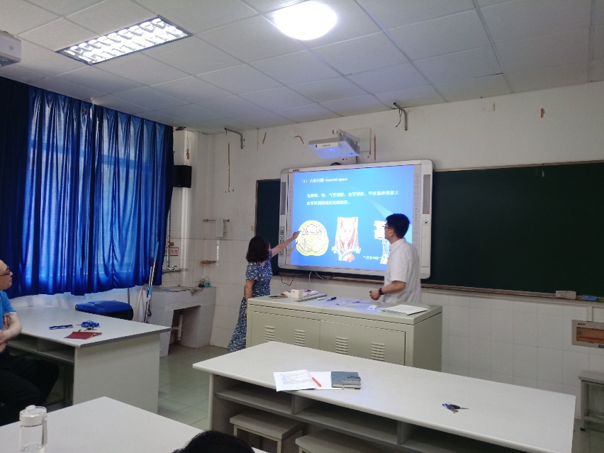 大家首先讨论了如何优化课程教学及成绩考核评定。大家在如何根据解剖学的学科性质特点,在教学过程中有效融入课程及利用雨课堂进行过程性考核、过程性考核测试题的题型及题目数量、考试题目出题方式进行改革,从而更加客观地考察学生知识综合运用的能力等方面达成了共识。随后是示范性教学,曲德伟老师为大家演示了颈部断层解剖学的示范教学。示范教学演示结束后,大家针对这一部分断层解剖学教学内容及效果的优化展开了热烈的讨论,提出了改进的意见和建议。