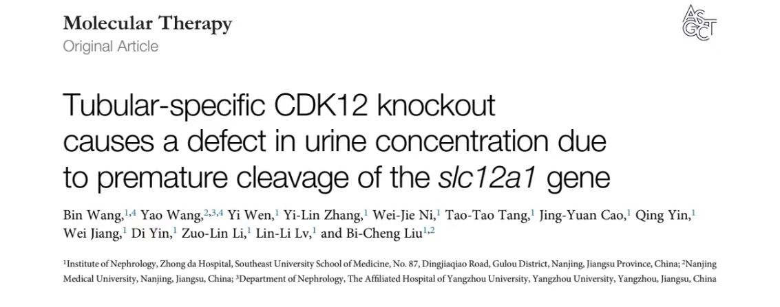 近日,东南大学肾脏病研究所刘必成教授、王彬副主任医师团队在《Cell》子刊《Molecular Therapy》(IF:11.454)在线发表了题为“Tubular-specific CDK12 knockout causes a defect in urine concentration due to premature cleavage of the slc12a1 gene”的论著。