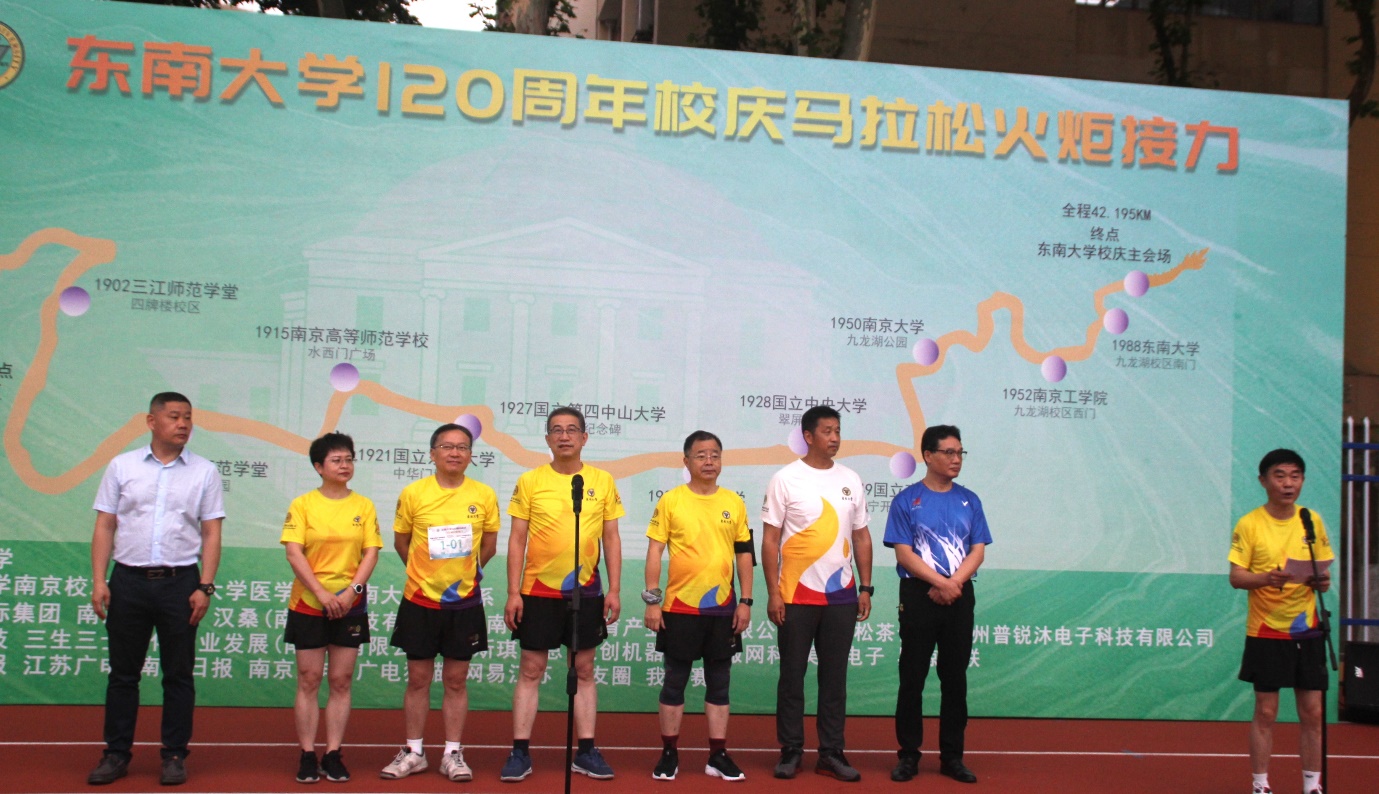 邱海波在致辞中表示,丁家桥校区是中国历史上第一个马拉松比赛的终点,今天作为东南大学120周年校庆马拉松火炬接力的起点,不仅弘扬了体育精神、增进校友和在校师生的情感,也体现了百廿东大,薪继火传,弦歌不绝,止于至善,未来东大人将更好地践行以科学名世,以人才报国的办学理念,踔厉奋发。他手持引火火炬,从太阳光焰火种引燃,该火种为6月2日自钟山西峰之巅——紫金山天文台撷取。随后,邱海波引燃滕皋军手中的第一棒火炬,滕皋军作为第一棒的领跑者,带领200余位师生校友开跑。