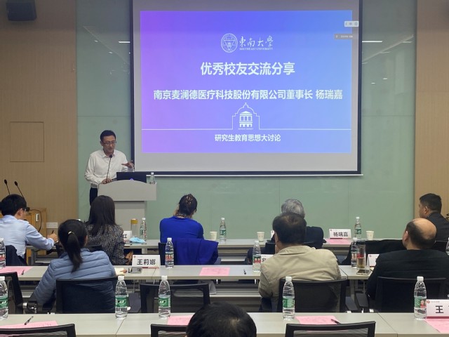 会议第二阶段是进行研究生教育思想大讨论——校友交流会,目的是通过分享校友的人生经历及感悟,凝聚校友的力量和智慧,进一步了解校友所思、所想和所盼,为学校建设发展建言献策。医三亿体育(中国)2007届硕士研究生杨瑞嘉校友,现任南京麦澜德医疗科技股份有限公司董事长兼集团总裁,他分享了自己成功创业的经验。他认为,现在医学相关科技赛道火热,发展非常迅速,需要更多的具有医学背景的人才加入,要善于从临床问题中洞察创新点。他指出,医药相关产业对人才的要求越来越高,希望学校在人才培养方面尽量拓展课程广度,更加注重学科交叉,培养具有发现问题、解决问题能力的复合应用型人才。