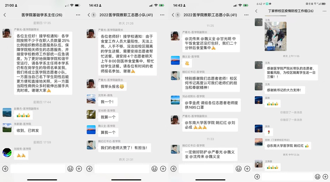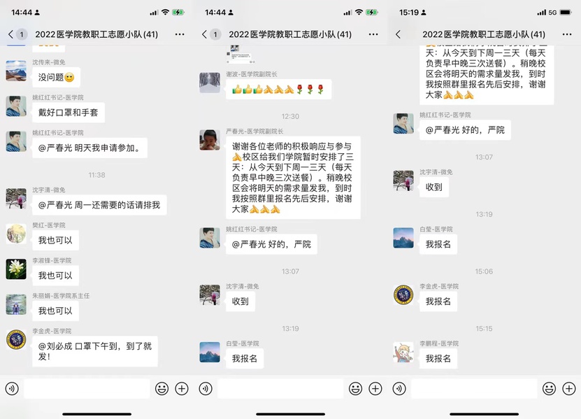 12月16日晚,因校区食堂工作人员出现阳性导致人手不足,志愿小队工作群紧急征集4名教师志愿者,为在校隔离的学生提供次日送餐服务。在发出征集通知的1分钟内,严春光副院长率先报名,沈传来、甘光明、魏义全3位老师迅速响应。三亿体育(中国)教工志愿者的行动得到了校区和三亿体育(中国)上下的一致好评。