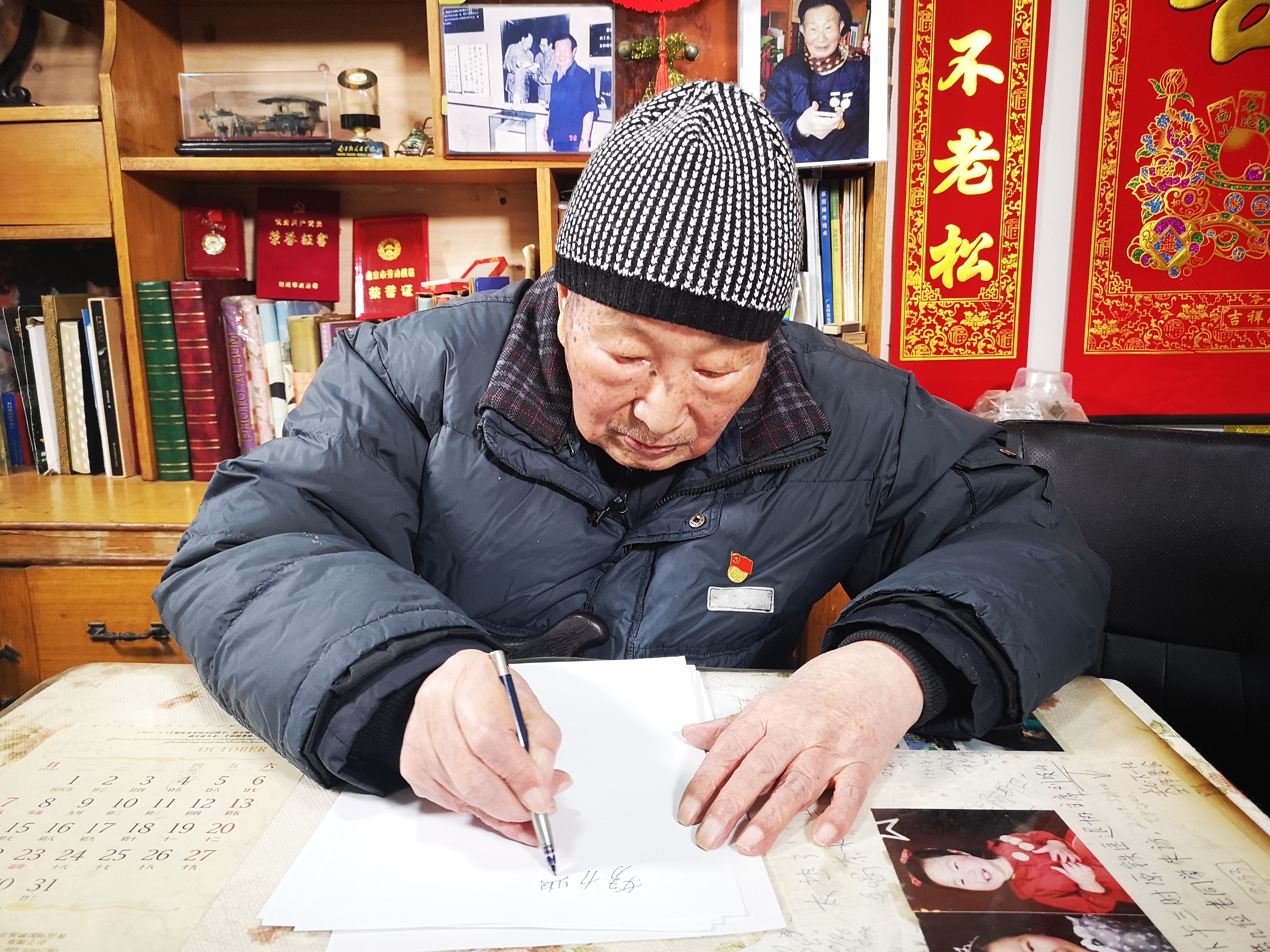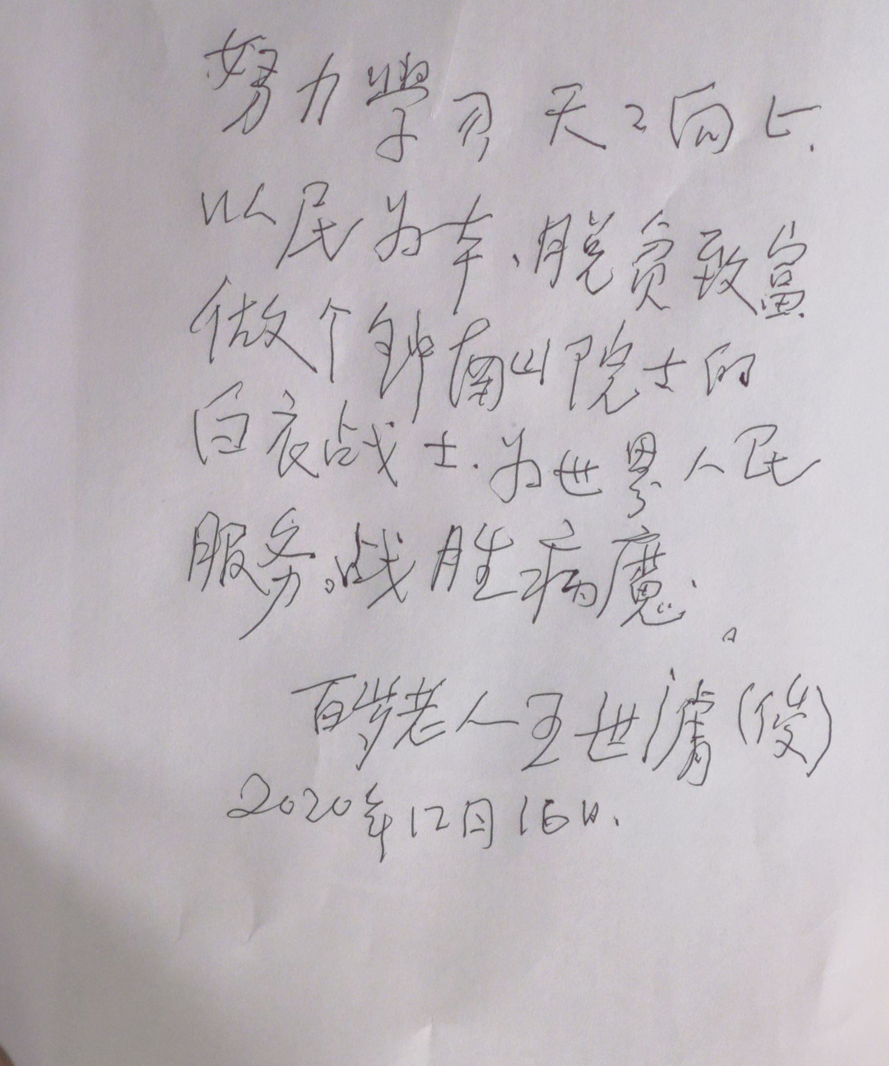 王世浚教授是一位在党四十多年的优秀共产党员。他用一生践行着自己的入党誓言,与党同呼吸、共命运,把对党的忠诚和热爱深深扎根于心底。他生前曾获得铁道部优秀共产党员、南京市劳动模范等荣誉称号,并获得全国铁路总工会颁发的“火车头”金质奖章。在庆祝建党百年前夕,医三亿体育(中国)组织部分学生党员深入采访了这位百岁老党员。他热情地向同学们重温了自己的入党初心经历、回顾了在党的教育引导下满腔热情工作的历程、抒发了对党对祖国十分挚爱的情怀。在回答同学们所提出的关于如何发挥共产党员的模范带头作用这一问题时,他不假思索、铿锵有力、郑地有声地说:“模范带头作用就是吃苦在前、享乐在后、争先进、做模范。你们在参加共产党前,你就应该有带头模范作用,在入党的时候,就应该有这种信念。”临行前,他欣然提笔,用苍劲豪放的笔触,饱含深情地勉励同学们:“努力学习,天天向上,以民为本,脱贫致富。做个像钟南山院士那样的白衣战士,为世界人民服务,战胜病魔。”(附图3、4 )参访的同学均无比震撼地认为,王老师的热切希望犹如灿烂阳光照亮了他们前行的路,同时也是他们前行路上永不枯竭的原动力。