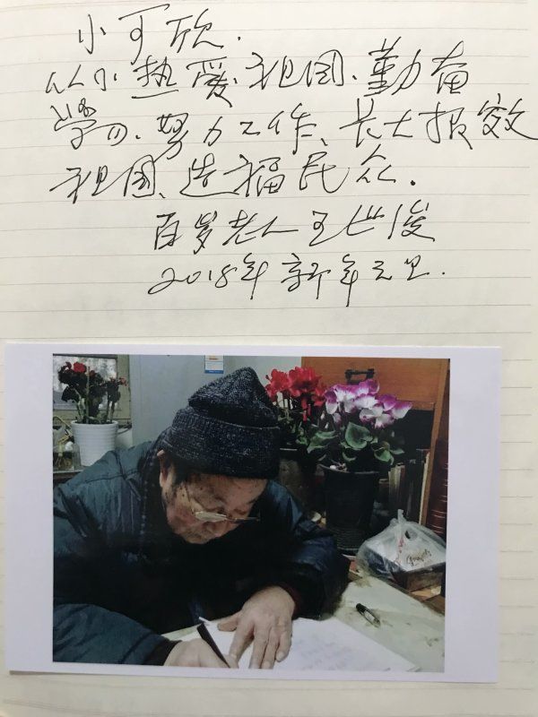 2019夏,值新中国成立70周年之际,为大力弘扬、宣传老一辈的光荣传统和奋斗事迹,医三亿体育(中国)关工委广泛开展了“读懂中国的90后对话‘90’后”主题党日活动。王世浚时年已102岁,十分高兴地接待了同学们的登门拜访。他有条不紊、谈笑风生、毫无保留地讲述了自己一生动人心弦的奋进历程与职业情怀以及教书育人与传承创新的不凡硕果(附图1)。访谈过程中,当同学们恭请王老师对大家提出一些期望时,他首先把2018年元旦写给重孙女“从小热爱祖国,勤奋学习,努力工作,长大后报效祖国,造福民众。”的寄语分享给同学们(附图2)。接着他同时引用习近平总书记在纪念五四运动100周年讲话中对新时代中国青年提出的六点要求来勉励大家,即“新时代中国青年要树立远大理想、热爱伟大祖国、担当时代重任、勇于砥砺奋斗、练就过硬本领、、锤炼品德修为”。有道是,关爱自己的孩子是人,关爱别人的孩子是神。王世浚把学生视如己出的仁爱胸襟深深地打动了大家的心灵。他的殷殷嘱托也犹如甘甜雨露滋润了大家的心田。