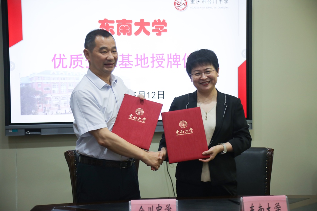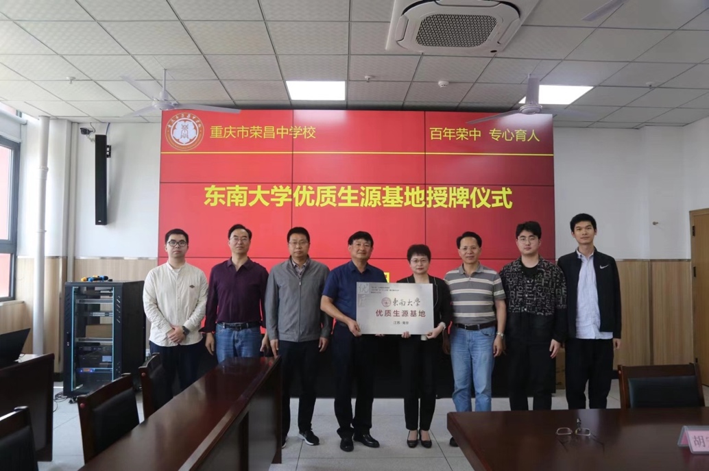5月12日下午,东南大学重庆招生组一行至重庆市荣昌中学举行“优质生源基地”授牌仪式,重庆市荣昌中学校长胡安泽,教务处主任李海棠,教务处副主任杨闯,招生处主任杨勇等领导参加了授牌仪式。胡安泽校长代表全体师生对东南大学“优质生源基地”落户我校表示热烈欢迎,介绍了荣昌中学的办学历史、办学理念,发展概况与办学成绩。三亿体育党委书记姚红红介绍了东南大学的基本情况、办学特色和成果,表达了对荣昌中学优质生源基地的高度重视。最后,姚书记与胡安泽校长共同签订了“优质生源基地”建设协议书,姚书记代表东南大学授予我校“东南大学优质生源基地”牌匾。