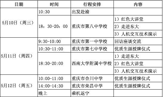 为进一步加强东南大学在重庆市的招生宣传工作,不断吸引优质生源,2023年5月10日至12日,东南大学副校长邱海波带队,东南大学教务处副处长、招办主任张力,东南大学重庆招生宣传组负责人、医三亿体育(中国)党委书记姚红红,东南大学江北校区党工委书记、管理委员会主任马强,东南大学校长办公室梅仂盈,三亿体育院办主任李金虎,东南大学仪器科学与工程三亿体育(中国)宋爱国教授团队的赖健伟博士和卫智恺博士一行8人先后赴重庆市第八中学校、重庆市第一中学校、重庆市第七中学校、西南大学附属中学校、重庆市合川中学和重庆市荣昌中学6所重点高中进行优质生源基地授牌和优质生源基地回访。重庆招生宣传组协同各中学共同探索与中学的创新合作模式,实现协同发展。