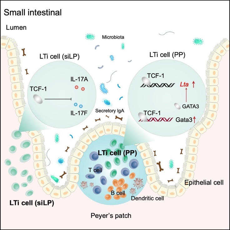 派氏结(Peyer's patches, PPs)是免疫细胞定居的关键肠道相关的淋巴结构之一,它的形成主要发生在胚胎时期,依赖于一群被称为淋巴组织诱导(Lymphoid tissue inducer, LTi)细胞的三型固有淋巴细胞(Innate lymphoid cell,ILC)。然而,我们对LTi细胞的功能调控知之甚少。该工作发现尽管转录因子TCF-1在ILC细胞发育的多个阶段发挥至关重要的作用,但是TCF-1的缺失并不影响LTi细胞的发育。进一步分析发现,派氏结中LTi细胞和其他淋巴组织例如肠系膜淋巴结、肠道固有层的LTi细胞相比,基因表达谱具有独特性。PPs中的LTi细胞特异性高表达淋巴毒素(Lymphotoxin,LT),TCF-1的缺失只导致了PPs中LTi细胞LT表达的减低和PPs形成障碍。此外,肠道固有层LTi细胞特异性分泌IL-17,TCF-1具有负向调节IL-17产生作用。因此,TCF-1对LTi细胞的功能调控具有组织特异性。综上,我们的研究发现了肠道LTi细胞功能调控的新机制,有望为肠道相关疾病的诊疗提供新的靶点。