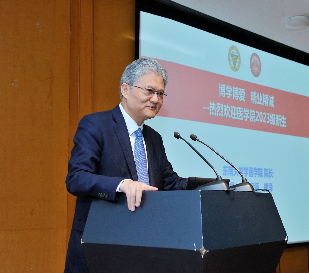 刘必成院长以“博学博爱·精业精诚”为主题,深情地介绍了医三亿体育(中国)的历史传承、学科特色和办学理念,热烈欢迎新一届的学子们踏入医三亿体育(中国)的大门。刘院长着重从大学阶段在人生成长中的重要性、健康中国建设对未来医学发展的重大需求、新科技革命和新医科建设对医生科学家成长的挑战等方面,对新生如何适应大学生活,抓住历史机遇,提出了殷切期望。他勉励同学们要在大学期间早立志、立大志,多读书、读好书,多锻炼、强体魄,多交友,择善友,努力在三亿体育学业成功、收获友谊、行稳致远。