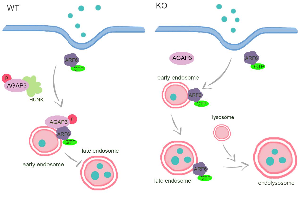 激素相关激酶(HUNK)是一种丝氨酸/苏氨酸蛋白激酶,在肿瘤发生中发挥着多种角色。为了探索HUNK在癌中的分子功能,研究人员通过对敲除HUNK细胞的转录组进行京都基因与基因组百科全书(Kyoto Encyclopedia of Genes and Genomes)分析,发现HUNK可以影响细胞内吞和内体运输。通过对不同内吞途径的深入研究,研究人员发现,HUNK敲除细胞会促进物质(如牛血清白蛋白)的摄取,而且主要选择性地抑制小窝蛋白介导的内吞,并且依赖其激酶活性。小窝是细胞膜上50-100纳米的洞穴样凹陷,对细胞吸收和运输某些毒素、细菌、病毒、生长因子和某些循环蛋白非常重要。同时,HUNK敲除细胞系中,内体标记物(Rab5、和Rab7)和溶酶体标记物(LAMP1)的共定位表明敲除细胞中的早期内体/晚期内体/溶酶体递送途径增强,早期内体向晚期内体转化加快,内吞溶酶体的形成增加。通过超分辨显微镜和纳米颗粒检测技术等手段检测发现HUNK敲除细胞中的溶酶体更大、更多,进一步表明了HUNK敲除对内吞溶酶体的形成具有促进作用。活细胞荧光影像也揭示了敲除细胞系中内体的运输和融合的加快。分子机制的研究中,通过蛋白互作和体外磷酸化技术发现HUNK磷酸化AGAP3的丝氨酸396位点(S396)。AGAP3的磷酸化促进了其在早期内体中的定位,进而导致ARF6的GTP水解,从而减少早期向晚期内吞体的转化,并最终降低了内吞溶酶体的大小和数量。以白蛋白为货物模型,在HUNK敲除细胞系中研究发现小窝更快地内吞白蛋白,并实现了更好的溶酶体定位和降解。同时,HUNK敲减的结直肠癌细胞更高效地内吞化疗药物白蛋白紫杉醇,进而实现了更好的肿瘤杀伤,HUNK抑制剂和白蛋白紫杉醇的联合也展现出更好的治疗效果。