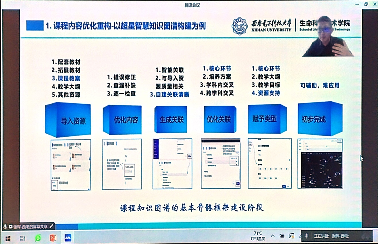 西安电子科技大学谢晖教授应邀作题为“基于知识图谱的数智一体化课程建设及个性化育人实践”的专题报告,以国内外混合式教学与知识图谱的发展历程为切入点展开,详细介绍了知识图谱的建设意义与建设方法,为老师们线上示范如何运用知识图谱创新课堂教学。