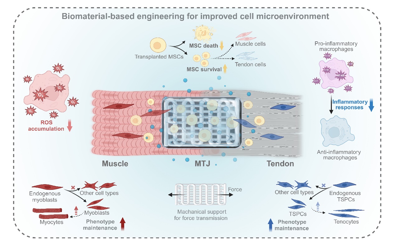 针对这一挑战,研究团队利用3D打印技术制备了聚乳酸-羟基乙酸共聚物支架,与可光交联的丝素蛋白水凝胶相结合,并负载了间充质干细胞和重组蛋白Klotho,构建出一种新型的多功能纤维增强水凝胶,为MTJ的结构重建和功能再生提供足够的力学支持并有效调控MTJ损伤后的病理微环境。该支架体系可以通过改善细胞炎症和氧化应激微环境,对移植的外源间充质干细胞、MTJ处的常驻内源细胞(肌肉细胞、肌腱细胞及巨噬细胞)等多种细胞群体进行功能性调控,从而有效促进MTJ损伤修复。此项研究聚焦于MTJ损伤这一临床难题,首次全面评估了组织工程策略用于MTJ再生修复的体内功能恢复效果,在目前临床上尚无有效治疗方法的现状下,为MTJ的治疗提供了全新的解决思路。