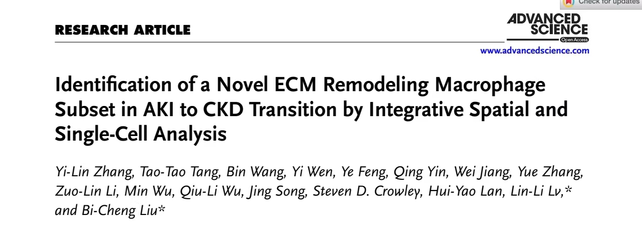 急性肾损伤(Acute kidney injury, AKI)是临床常见的急危重症,不仅会引起严重的急性机体内环境紊乱而威胁患者生命,越来越多研究还发现,AKI进展为慢性肾脏病(CKD)的风险显著增加,是CKD形成和终末期肾病发生的重要原因,但其确切机制尚不清楚,是肾脏病领域备受关注的重大科学问题。三亿体育刘必成和吕林莉教授团队在科技部重点研发计划和国家自然科学基金重点项目等资助下,对此进行了深入研究,取得重要进展,相关成果近期在《Advanced Science》在线发表研究论文,题为“Identification of a Novel ECM Remodeling Macrophage Subset in AKI to CKD Transition by Integrative Spatial and Single-Cell Analysis”。