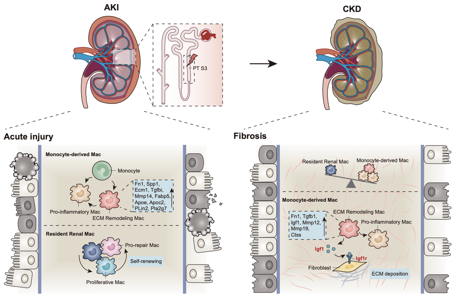 该研究刷新了人们既往对巨噬细胞在AKI to CKD转化中的固有认识,加深了人们对巨噬细胞在急性肾损伤和修复过程中时空异质性及其与固有细胞相互作用机制的理解,为重新认识肾小管间质炎症和纤维化发生机制,并制订靶向抗炎和抗纤维化治疗新策略提供了重要的理论依据。本文第一作者为张奕琳博士和汤涛涛副研究员,通讯作者为刘必成教授和吕林莉教授(下图为本研究理论示意图)。
