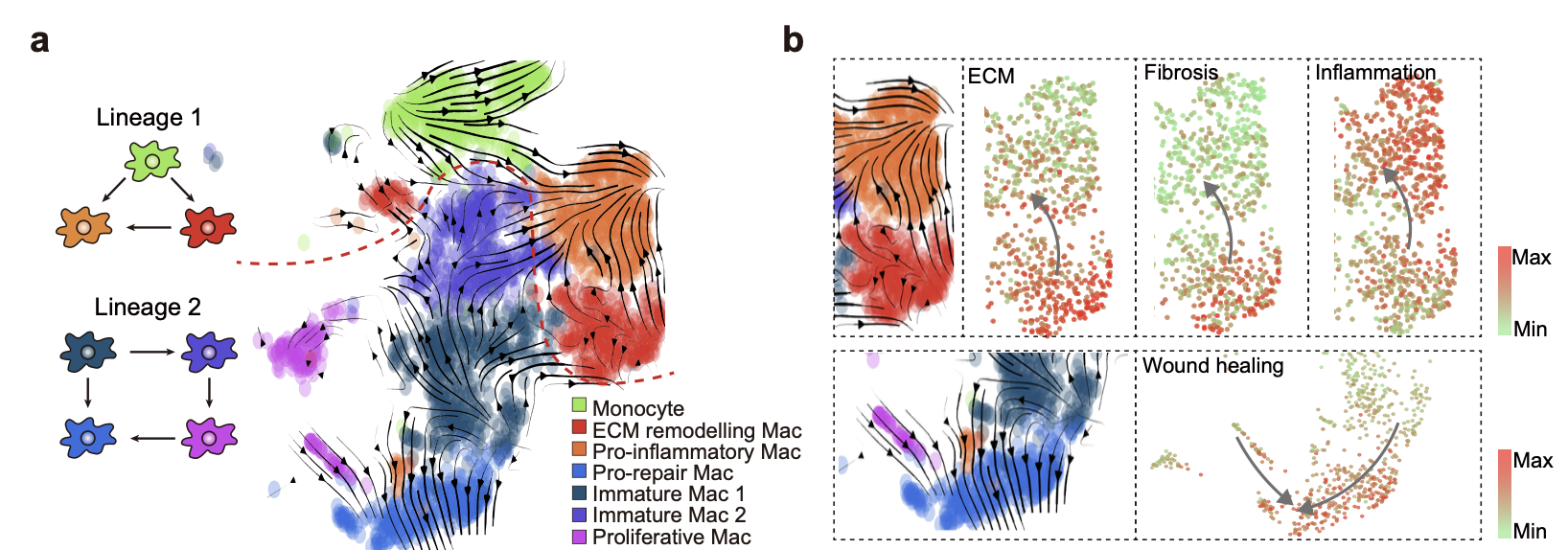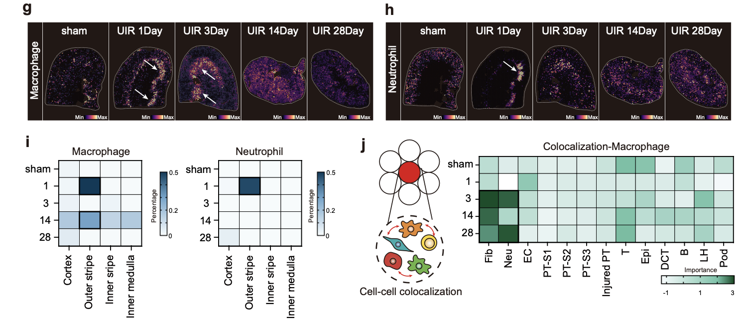 研究者通过绘制肾脏免疫细胞及固有细胞图谱并进行细胞溯源和功能分析,发现在AKI后的第1天,巨噬细胞浸润显著增加,随后在AKI后的第14天达到第二个高峰。空间转录组分析揭示,在AKI早期,巨噬细胞大量浸润在小管受损严重的皮髓交界区,而在慢性阶段则与成纤维细胞具有空间临近性。