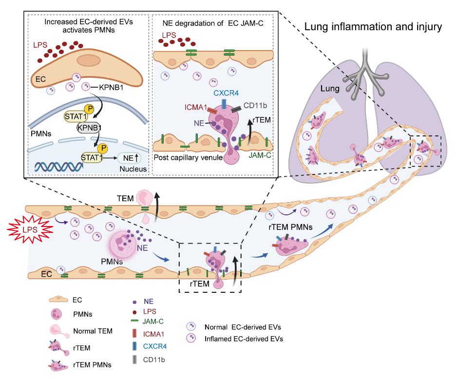 本研究发现,脓毒症时中性粒细胞可从炎症部位反向迁移至脉管系统,这一过程被称为反向跨内皮迁移(rTEM)。经历rTEM的中性粒细胞功能显著激活且存活时间长。通过双光子活体成像等多种方法证实,该类细胞经循环向肺脏募集增多继而引发远端肺部炎症和损伤。进一步通过多组学分析及机制研究表明,脓毒症时内皮源性细胞外囊泡(EVs)的核转运蛋白 beta 1(KPNB1)通过激活STAT1和上调中性粒细胞弹性蛋白酶进而降解内皮中连接粘附分子C,最终促进中性粒细胞启动rTEM。