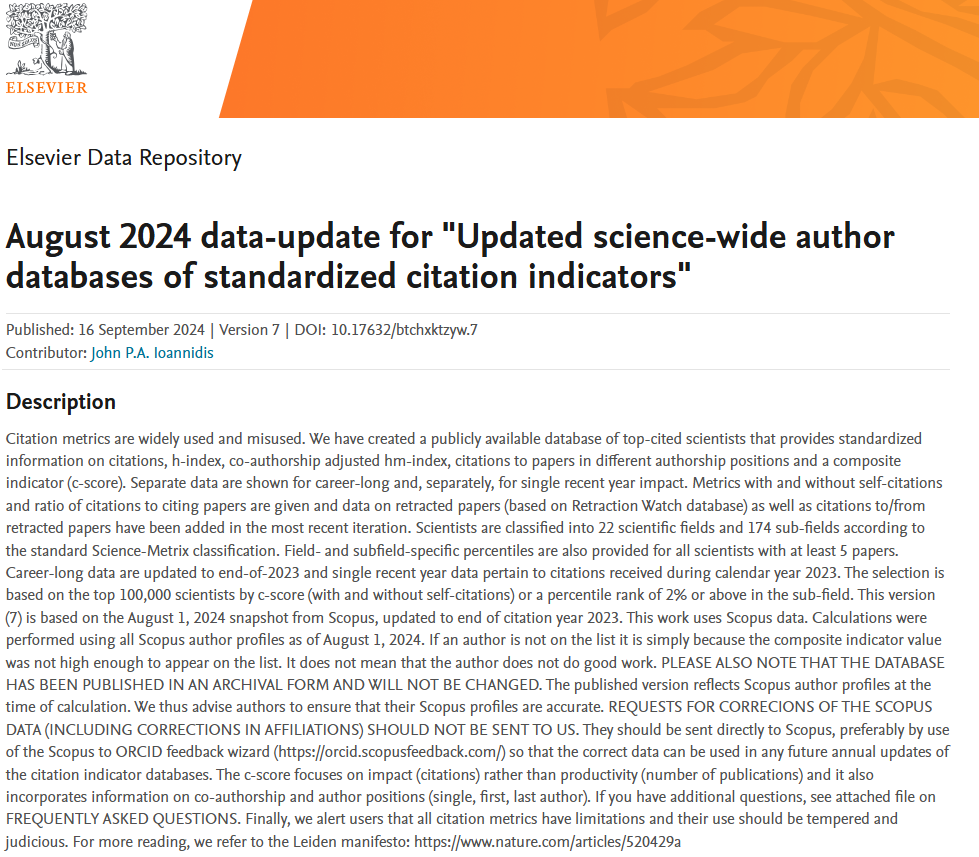 全球前2%顶尖科学家榜单由斯坦福大学John P.A.Ioannidis教授团队发布,爱思唯尔提供数据支持,此合作项目基于Scopus Author Profile(学者档案)从"终身影响力"和"年度影响力"两个维度观测全球科研学者,遴选出世界排名前2%的顶尖科学家,并每年将榜单数据源公开发布在Elsevier Data Repository。