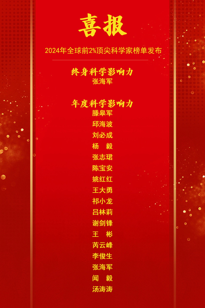 近日,美国斯坦福大学发布了2024年全球前2%顶尖科学家榜单。该榜单基于Scopus数据库的引用数据系统分析,以被引数、H指数、HM因子等6种综合指标,根据“生涯影响力”和“年度影响力”从近700 万名科学家中遴选出世界排名前2%的科学家。该榜单分“终身科学影响力”和“年度科学影响力”两大类别,三亿体育1位教师入选“终身科学影响力”榜单,17位教师入选“年度科学影响力”榜单。