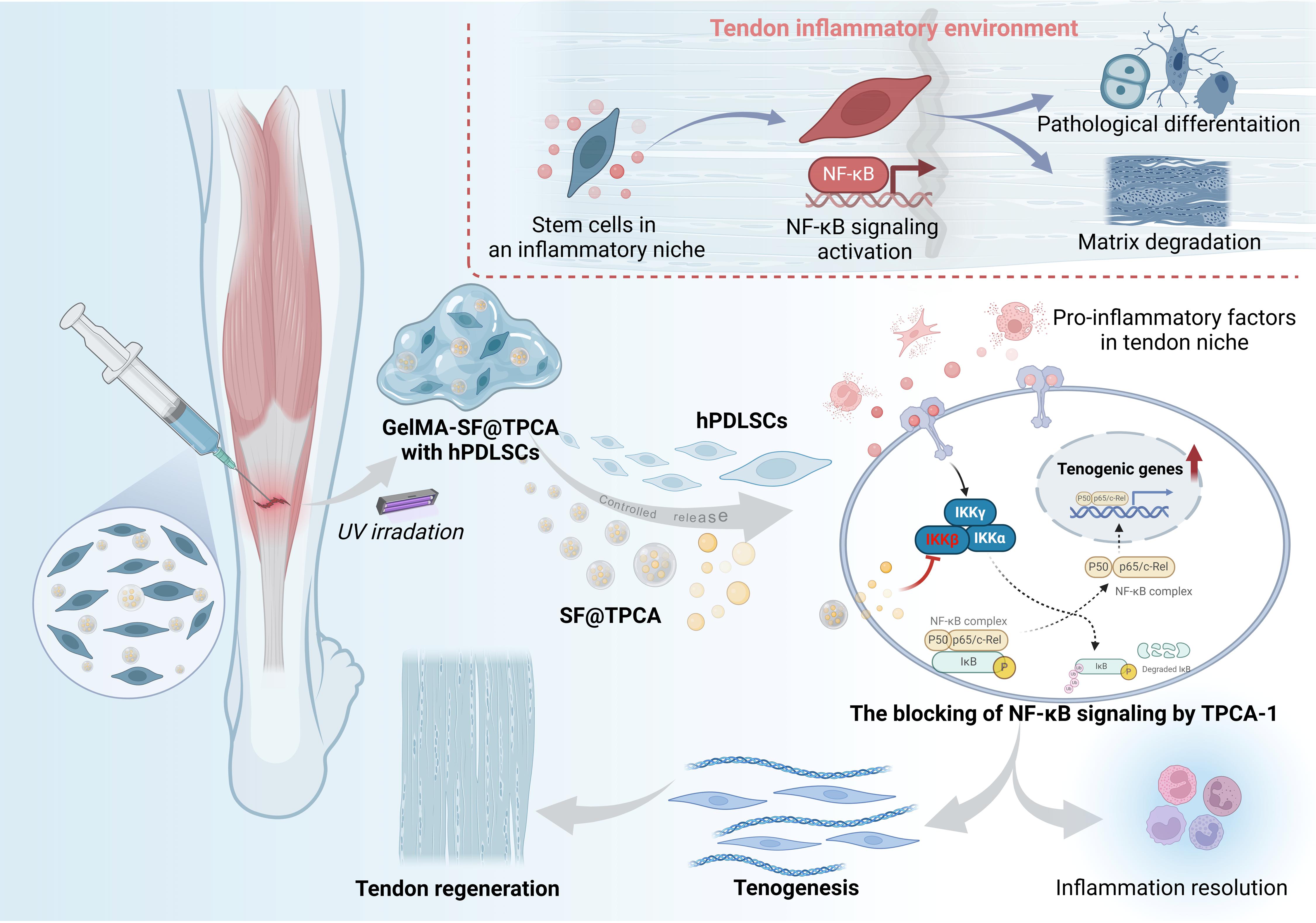 近日,三亿体育张薇/陈佳林团队与芮云峰团队、瑞典于默奥大学Ludvig J. Backman团队合作在国际权威学术期刊《Bioactive Materials》(IF=18)在线发表题为“Controlled TPCA-1 delivery engineers a pro-tenogenic niche to initiate tendon regeneration by targeting IKKβ/NF-κB signaling”的研究论文,该研究揭示了急性损伤肌腱的炎症环境中,NF-κB信号通路抑制干细胞成腱过程,并提出了一种联合抗炎干预与和干细胞移植以促进肌腱再生的新策略。