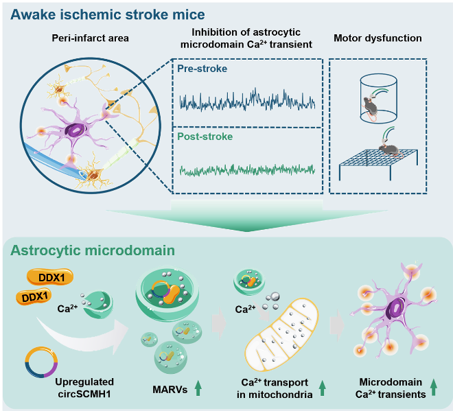 姚红红课题组借助南京脑观象台微型化双光子显微镜和腺相关病毒特异性标记星形胶质细胞钙信号,证实在清醒的缺血性卒中小鼠梗死周围区星形胶质细胞微区域钙瞬变显著减少。在缺血性卒中小鼠自由运动期间,对星形胶质细胞微区域钙瞬变的实时监测表明,星形胶质细胞微区域钙瞬变的减少与行为缺陷同步发生。进一步研究发现,DDX1与circSCMH1结合,促进钙离子从MARVs到线粒体的转运,调控星形胶质细胞微区域钙瞬变。而特异性下调星形胶质细胞的DDX1表达,能够抑制MARVs的形成,减少微区域钙瞬变,并阻碍缺血性卒中后脑功能修复。