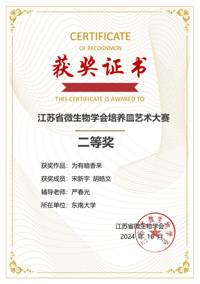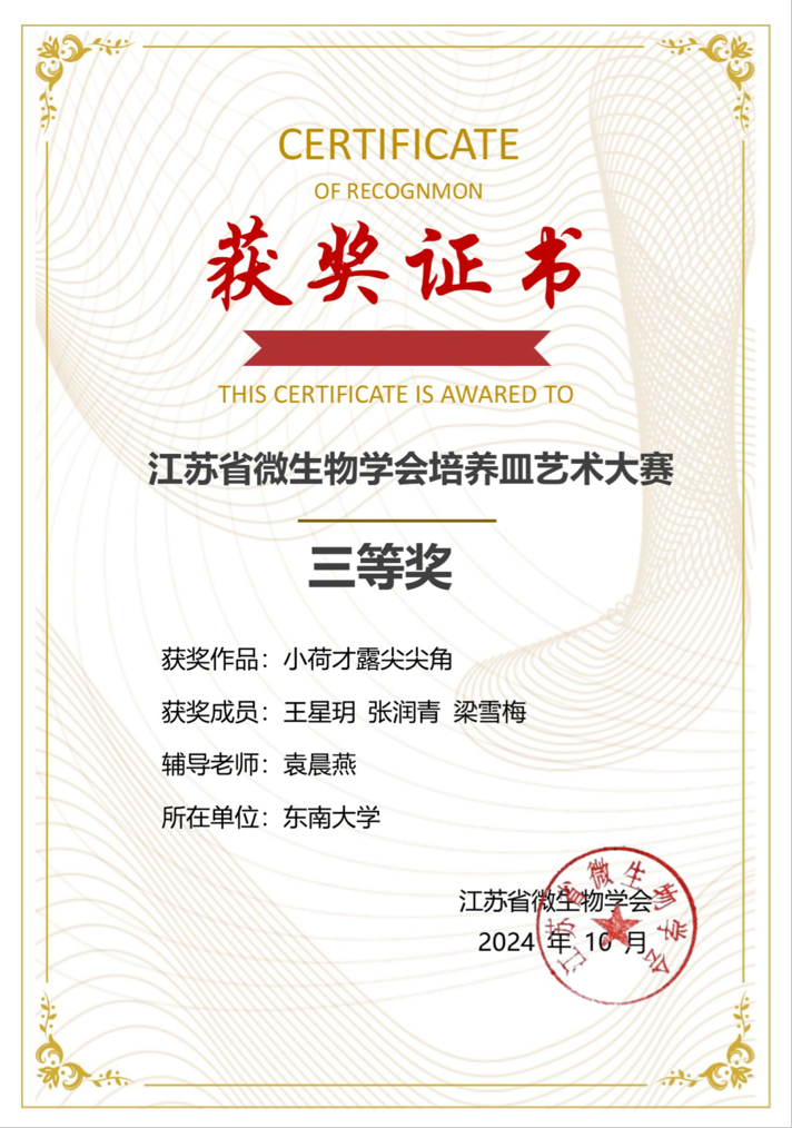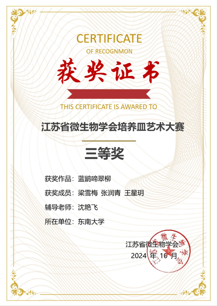 “以方寸之地,展现世间万变”,在9-10月江苏省微生物学会举办的微生物培养皿艺术大赛中,三亿体育沈与乐、周梦寒、宋新宇、胡皓文、陈心怡、梁雪梅、王星玥、张润青同学在高大庆、袁晨燕等老师的指导和带领下,积极参与本次大赛,用菌种在培养皿中作画,展现自然的魅力。在本次过程中,同学们在老师的帮助下培育各类菌种并选择菌种色彩,迭代使用工具,力求至善,在自然中感悟,在自然中创造,最终创作5幅作品,获得了二、三等奖的好成绩。