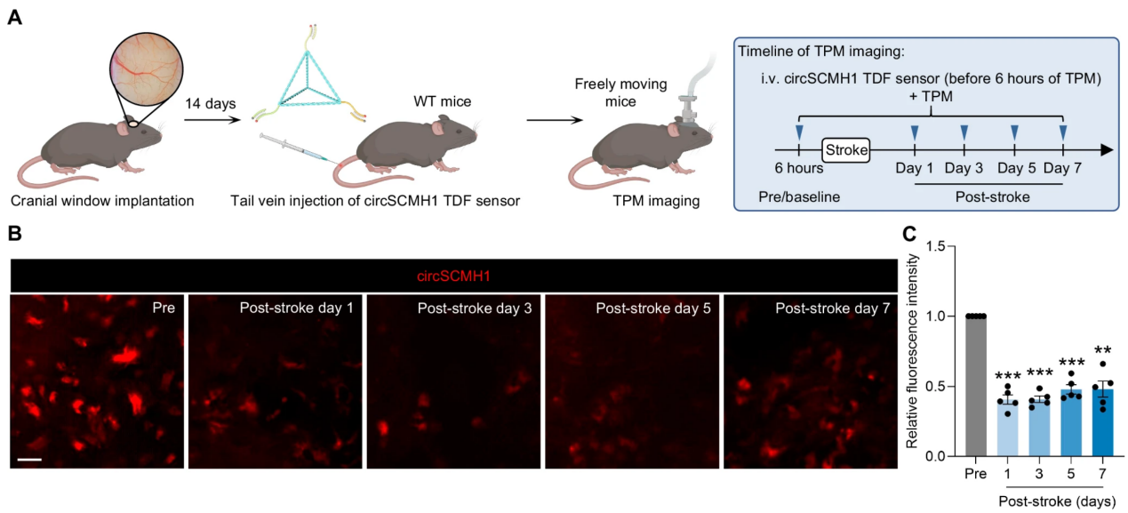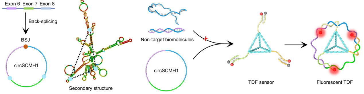 环状RNA是一类具有共价闭环结构的特殊RNA分子,是脑功能调控和神经精神疾病病理进程中的重要调控分子,在神经系统疾病诊断和治疗方面具有重要应用前景。然而环状RNA的低丰度、复杂二级结构和与线性RNA的相似性使得其在检测和成像面临诸多挑战。如何快速、高灵敏、特异地检测环状RNA是亟待解决的科学问题。