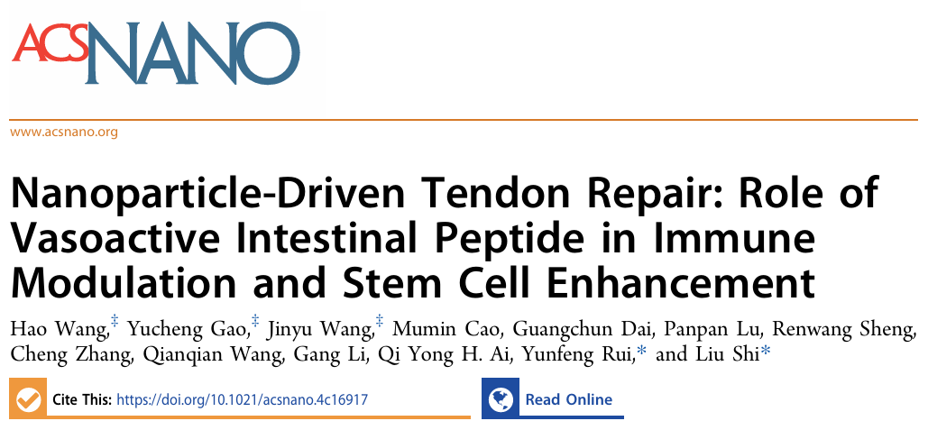 近日,三亿体育外科学系石柳/芮云峰教授团队在国际权威学术期刊ACS Nano(《美国化学学会纳米杂志》,IF 15.8,中科院1区)在线发表原创性研究论文,题为“Nanoparticle-Driven Tendon Repair: the Role of Vasoactive Intestinal Peptide in Immune Modulation and Stem Cell Enhancement”,该研究聚焦负载血管活性肠肽纳米颗粒通过调节免疫稳态与干细胞功能促进肌腱内源性修复能力,提出肌腱损伤修复新策略。