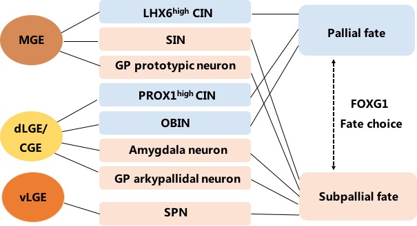 端脑由位于背侧的皮质区和位于腹侧的皮质下区组成,端脑的神经活动及可塑性由神经环路的兴奋-抑制平衡所调控,而GABA能神经元通过释放γ-氨基丁酸在兴奋-抑制平衡中发挥闸控信息的作用。GABA能神经元功能异常可导致癫痫、精神分裂症、自闭症谱系障碍等多种神经精神疾病。端脑GABA能神经元分为两大类群,即皮质GABA能中间神经元和皮质下区GABA能投射/中间神经元。在发育过程中,皮质GABA能神经元和皮质下区GABA能神经元这两大类群均起源于基底神经节隆起的神经干细胞,通过不同的命运特化机制分化成为功能各异的神经元类型,并分别定位于皮质或皮质下区,但是,是否存在一种机制决定了皮质和皮质下区GABA能抑制性神经元这两大类群的命运抉择尚不明了。另一方面,皮质和皮质下区的两大类群GABA能神经元又包含多种亚型,如皮质GABA能神经元主要包括多种亚型的皮质抑制性中间神经元等,而皮质下区GABA能神经元既包括纹状体苍白球的中间神经元、也包括长投射神经元。然而,目前这些不同亚型GABA能抑制性神经元命运特化的调控机制也所知甚少。